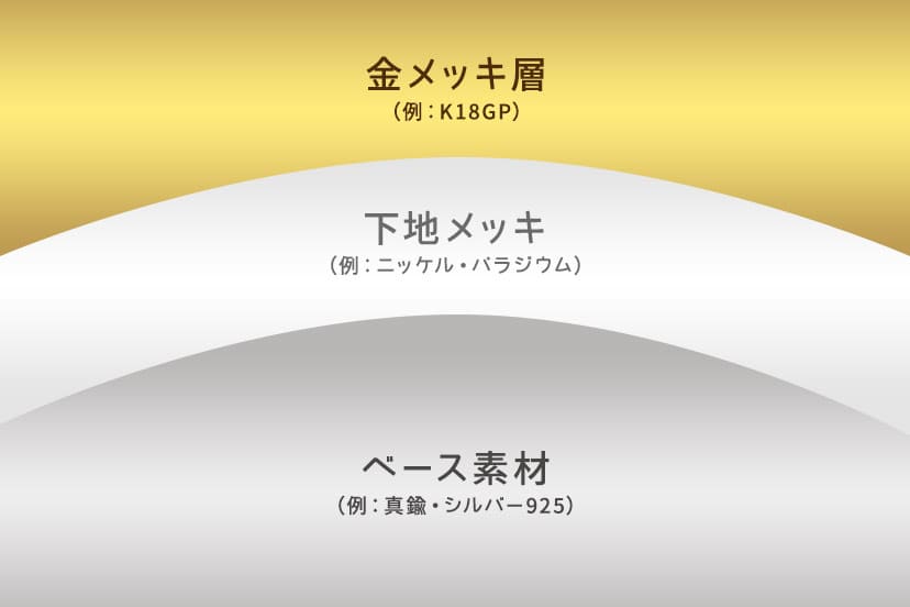 金(ゴールド)はかなりやわらかい金属なので、メッキにそのまま使おうとすると、剥がれやすくなります。