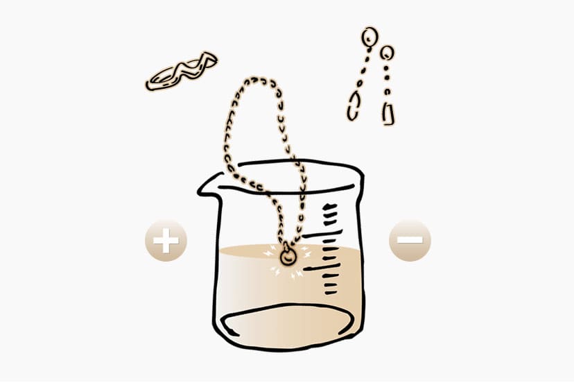 アクセサリーで一般的に使われるのは、湿式メッキ(電気メッキ)です。